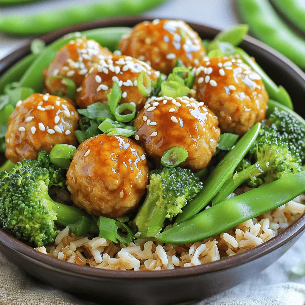 You need ground chicken or turkey for the meatballs. This choice keeps the dish lean yet flavorful. Breadcrumbs and Parmesan cheese add texture and taste. An egg binds everything together. For the bowl, I love using cooked brown rice. It gives a nice nutty flavor and is healthy. The fresh veggies, broccoli and snap peas, add crunch and color.