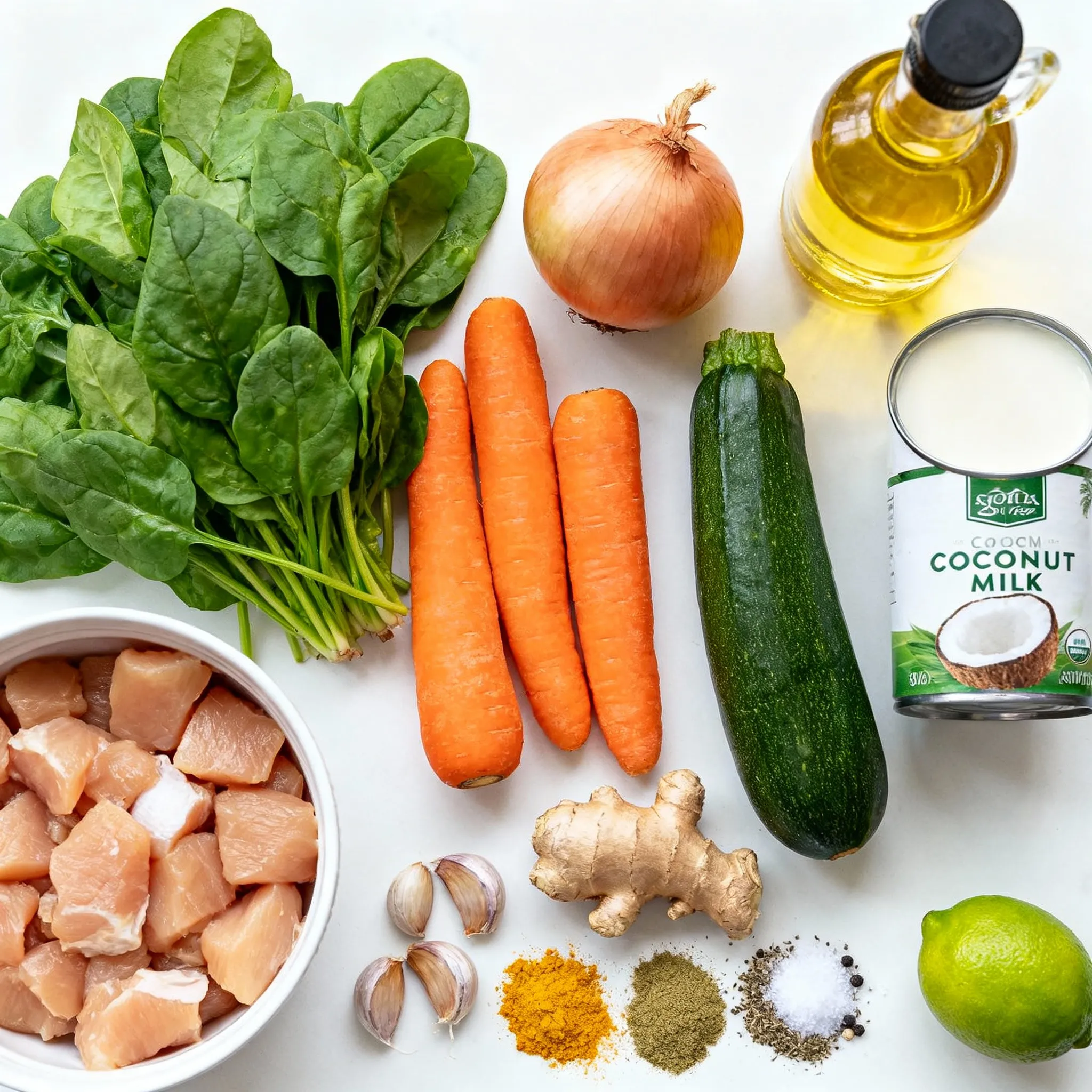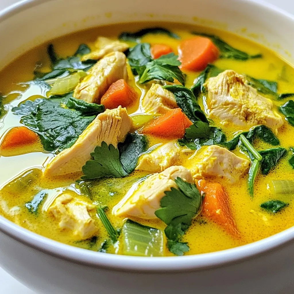 - 1 lb (450g) boneless, skinless chicken breasts, cut into bite-sized pieces - 1 tablespoon olive oil - 1 medium onion, finely chopped - 3 cloves garlic, minced - 1 tablespoon fresh ginger, freshly grated - 3 cups chicken broth (preferably low-sodium) - 1 can (400ml) coconut milk (full-fat for creaminess) - 2 teaspoons ground turmeric - 1 teaspoon ground cumin - 1 teaspoon ground coriander - 1 medium carrot, peeled and diced - 1 medium zucchini, diced - 1 cup fresh baby spinach - Salt and pepper, to taste - Juice of 1 fresh lime - Fresh cilantro leaves, for garnish In this soup, the chicken gives flavor and protein. The broth adds richness. I love the coconut milk for its creamy texture. It makes the soup feel cozy. The onion, garlic, and ginger create an aromatic base. They add depth and warmth to each bite. The spices like turmeric, cumin, and coriander bring a vibrant taste. - Fresh herbs (like cilantro) - Lime wedges Garnishing with fresh herbs brightens the soup. It adds a pop of color and freshness. A squeeze of lime juice makes the flavors shine. Both options elevate your soup to a new level. Enjoying it this way makes it even more special! {{ingredient_image_2}} Sautéing Aromatics Start by heating 1 tablespoon of olive oil in a large pot over medium heat. Once the oil is warm, add 1 medium onion, finely chopped. Cook the onion for about 5 minutes, stirring often, until it turns soft and clear. Next, add 3 cloves of minced garlic and 1 tablespoon of freshly grated ginger. Stir these in for about 1 minute until you smell that wonderful aroma. Cooking the Chicken Now, it’s time to add the chicken. Toss in 1 pound of boneless, skinless chicken breasts, cut into bite-sized pieces. Season the chicken with salt, pepper, 2 teaspoons of ground turmeric, 1 teaspoon of ground cumin, and 1 teaspoon of ground coriander. Stir everything well. Cook the chicken for about 5 to 7 minutes, stirring often, until the chicken is no longer pink. Adding Broth and Coconut Milk Once the chicken is cooked, carefully pour in 3 cups of chicken broth and 1 can of full-fat coconut milk. Stir until all the ingredients mix well. Increase the heat slightly to bring it to a gentle simmer. Incorporating Vegetables Next, add in your diced vegetables. This includes 1 medium carrot, peeled and diced, and 1 medium zucchini, diced. Stir them into the soup. Let the mixture simmer for 10 to 15 minutes. You want the veggies to be tender but still bright in color. Adding Spinach and Lime Juice Now, gently stir in 1 cup of fresh baby spinach. Cook this for another 2 to 3 minutes until the spinach wilts. After that, take the pot off the heat and squeeze in the juice of 1 fresh lime. Stir to mix the flavors. Adjusting Seasoning Finally, taste your soup. You may want to add more salt or pepper to enhance the flavor. Your turmeric chicken soup is now ready to serve! Garnish with fresh cilantro leaves for a bright touch. - Enhancing Spice Levels To boost the spice, add more ground turmeric or a pinch of cayenne. If you love heat, fresh chopped chilies work well too. Always taste as you go. This lets you find the right balance. - Achieving Perfect Creaminess Use full-fat coconut milk for a rich, creamy soup. It adds a smooth texture and rounds out the spices. If you want a lighter soup, try low-fat coconut milk but expect less creaminess. - Ideal Pairings This soup pairs well with crusty bread or rice. A nice side salad also complements it. For a twist, serve with whole grain crackers. - Presentation Tips Serve the soup in deep bowls to show off its vibrant color. Garnish with fresh cilantro for a pop of green. Add a sprinkle of black pepper or lime wedges on the side for extra flair. - Turmeric's Anti-Inflammatory Properties Turmeric has curcumin, a compound known for its anti-inflammatory effects. It may help reduce pain and improve overall health. Adding it to your diet is a smart choice. - Nutritional Value of Chicken and Vegetables Chicken provides lean protein, while veggies add vitamins and minerals. Carrots and zucchini are rich in fiber and nutrients. Spinach is loaded with iron and vitamins, making this soup both tasty and healthy. Pro Tips Fresh Ingredients Matter: Using fresh herbs and spices can significantly enhance the flavor of your soup, making it more vibrant and aromatic. Adjust the Creaminess: For a creamier soup, consider adding more coconut milk or blending a portion of the soup before serving. Customize Your Veggies: Feel free to substitute or add other vegetables like bell peppers or sweet potatoes for more flavor and nutrition. Marinate for Extra Flavor: If you have time, marinate the chicken in the spices and lime juice for 30 minutes before cooking for a more intense flavor. {{image_4}} You can make this soup vegan or vegetarian. Simply substitute chicken with tofu. Use firm tofu for the best texture. Cut it into bite-sized pieces. Sauté the tofu until golden brown. This adds a nice crunch. Instead of chicken broth, use vegetable broth. It keeps the soup rich in flavor. You can also add a splash of soy sauce for depth. Feel free to get creative with your veggies. Seasonal options like sweet potatoes or bell peppers work great. They add color and taste. If you like heat, add some chopped jalapeños or a pinch of cayenne. This will kick up the spice level. You can also take inspiration from global flavors. For a Thai twist, add lemongrass and lime leaves. Coconut milk gives it a creamy texture, making it rich and fragrant. For an Indian spiced version, try adding garam masala or curry leaves. These spices enhance the turmeric's flavor and aroma. Adjust the spices to your taste for a unique experience. To store leftover turmeric chicken soup, let it cool first. Transfer the soup to an airtight container. This helps keep the soup fresh and safe. You can store it in the fridge for up to three days. After three days, the soup may lose flavor and texture. Always check for signs of spoilage. If it smells off