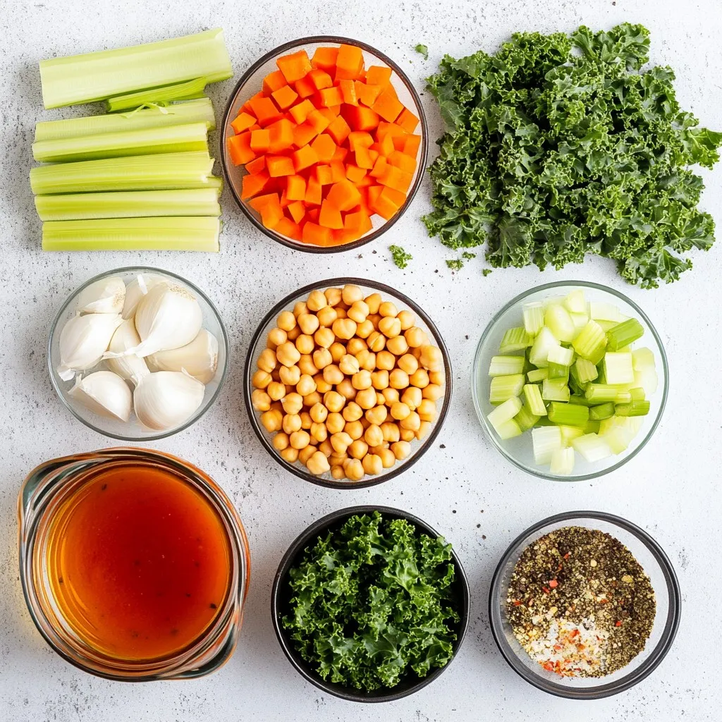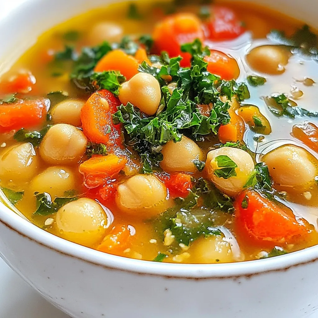 - 2 cans (15 oz each) chickpeas, thoroughly drained and rinsed - 1 medium onion, finely chopped - 2 cloves of garlic, minced - 2 medium carrots, peeled and diced - 2 celery stalks, diced - 1 can (14 oz) diced tomatoes in juice - 4 cups vegetable broth (low-sodium preferred) - 1 teaspoon dried oregano - 1 teaspoon dried thyme - 1 teaspoon smoked paprika - 2 cups kale, stems removed and shredded - 2 tablespoons extra virgin olive oil - Salt and freshly cracked black pepper, to taste - Fresh parsley, chopped (for garnish) For chickpeas, I suggest brands like Goya or Eden Foods. They offer great quality and flavor. For vegetable broth, consider using Imagine or Pacific Foods for a low-sodium option. These products help keep the soup balanced and tasty. When choosing olive oil, I favor extra virgin options from brands like Colavita or California Olive Ranch for their rich flavor. You can swap chickpeas with white beans for a different taste. If you don't have kale, spinach works well too. For the vegetable broth, you can use water, but it might lack flavor. Diced tomatoes can be replaced with fresh chopped tomatoes if you prefer. If you want a spice kick, add red pepper flakes instead of smoked paprika. {{ingredient_image_2}} Start by gathering your ingredients. You will need two cans of chickpeas, an onion, garlic, carrots, celery, diced tomatoes, vegetable broth, dried herbs, kale, olive oil, salt, and pepper. 1. Chop the onion: Cut it finely. This helps it cook faster and blend well. 2. Mince the garlic: Minced garlic adds great flavor. Be careful not to burn it. 3. Dice the carrots and celery: Peel and cut them into small pieces. This allows them to soften nicely. 4. Rinse the chickpeas: Drain and rinse them to remove excess salt. This keeps the soup fresh. 1. Heat the olive oil: Pour it into a large pot over medium heat. Wait until it shimmers. 2. Sauté the onion: Add it to the pot. Cook for about 3-4 minutes until it turns soft and clear. 3. Add garlic: Stir in the minced garlic and cook for one more minute. This releases its aroma. 4. Cook carrots and celery: Toss them in. Stir and cook for about 5-6 minutes. They should become tender. 5. Combine other ingredients: Add diced tomatoes, chickpeas, broth, oregano, thyme, and paprika. Mix well. 6. Bring to a boil: Turn up the heat. Once it boils, lower the heat and cover the pot. 7. Let it simmer: Cook for 20-25 minutes. This helps the flavors mix together. 8. Add the kale: Stir in the shredded kale. Cook for another 5 minutes until it's bright. 9. Season to taste: Add salt and black pepper. Adjust to your preference. - Use medium heat to sauté. This prevents burning and allows flavors to develop. - When simmering, keep the lid on. This helps retain moisture and flavor. - Check the soup at 20 minutes. If you want more flavor, let it simmer longer. - Always taste and adjust seasoning before serving. This ensures a balanced flavor. With these steps, you create a hearty and flavorful meal that warms the soul! To boost the flavor of Tuscan Chickpea Soup, try these simple tips: - Use fresh herbs: Swap dried herbs for fresh when possible. Fresh parsley or basil adds vibrant taste. - Add a squeeze of lemon: A splash of lemon juice brightens the soup. It brings out all the flavors. - Include parmesan cheese: Grate some cheese on top before serving. It adds a rich, savory note. - Experiment with spices: Try adding red pepper flakes for heat or a touch of cumin for depth. When making Tuscan Chickpea Soup, watch out for these pitfalls: - Not rinsing the chickpeas: Always rinse canned chickpeas. This removes extra salt and improves the taste. - Overcooking the kale: Add kale near the end of cooking. You want it tender but still vibrant. - Ignoring seasoning: Taste the soup before serving. Add salt and pepper to enhance the overall flavor. - Using low-quality broth: A good vegetable broth makes a big difference. Choose a low-sodium, flavorful brand. Pair your Tuscan Chickpea Soup with these delightful options: - Crusty bread: A slice of bread is perfect for dipping. It adds heartiness to your meal. - Simple salad: Serve with a light green salad. It adds freshness and balance to the meal. - Olive oil drizzle: A drizzle of high-quality olive oil on top is a nice touch. It enriches the soup’s flavor. - Wine pairing: Enjoy with a glass of Chianti. The wine complements the soup's rich flavors wonderfully. These tips will help you create a comforting bowl of Tuscan Chickpea Soup that shines with flavor and warmth. Pro Tips Chickpea Preparation: For a creamier texture, consider mashing a portion of the chickpeas before adding them to the soup. This will help thicken the broth and give it a richer mouthfeel. Flavor Enhancement: Allow the soup to sit for a while after cooking. The flavors will deepen and improve as it cools, making it even more delicious when reheated. Kale Substitutes: If kale isn’t available, feel free to swap it with other leafy greens like Swiss chard or spinach, which will also add vibrant color and nutrients. Serving Suggestions: Serve the soup with a sprinkle of red pepper flakes for a spicy kick, or pair it with a dollop of yogurt for a creamy contrast. {{image_4}} You can easily make this soup vegetarian or vegan. The base is already plant-based. Just choose vegetable broth that is low in sodium. Ensure all ingredients are vegan-friendly. This soup is hearty and full of flavor without any meat. Want to boost the nutrition? Add in some spinach or Swiss chard. They cook quickly and add vitamins. You could also toss in some diced sweet potatoes. They add sweetness and fiber. If you like, sprinkle in some seeds or nuts for crunch. To turn this soup into a stew, add more veggies. Consider adding potatoes or bell peppers. You can also thicken the soup by blending half of it. This makes it creamy and rich. Serve it with crusty bread. Enjoy a filling meal that warms you inside! To keep your Tuscan chickpea soup fresh, store it in an airt