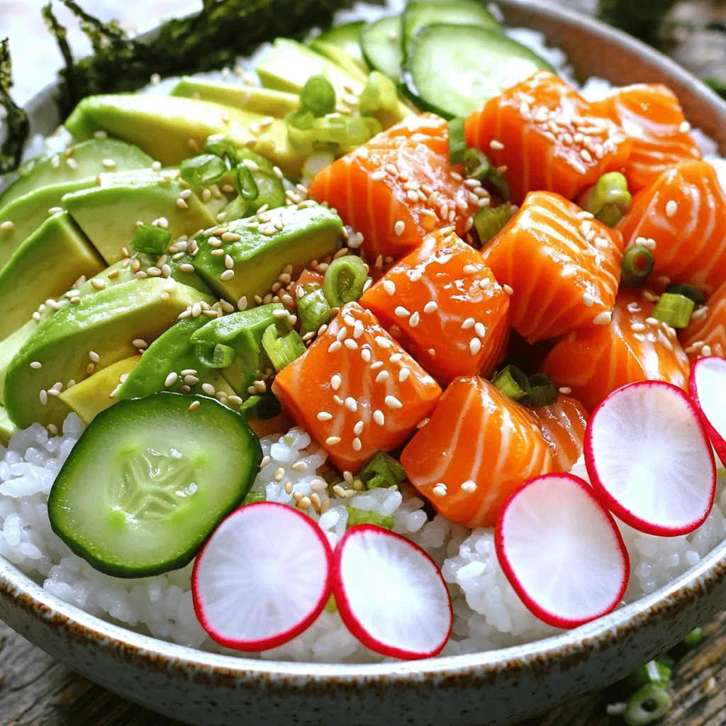 To make your bowl shine, start with high-quality, sushi-grade salmon. This fish must be fresh and safe to eat raw. Look for a bright color and a firm texture. When marinating the salmon, mix soy sauce, sesame oil, and sriracha for a bit of heat. Let the salmon sit in the marinade for about 10 minutes. This helps the flavors soak in and makes each bite delicious.