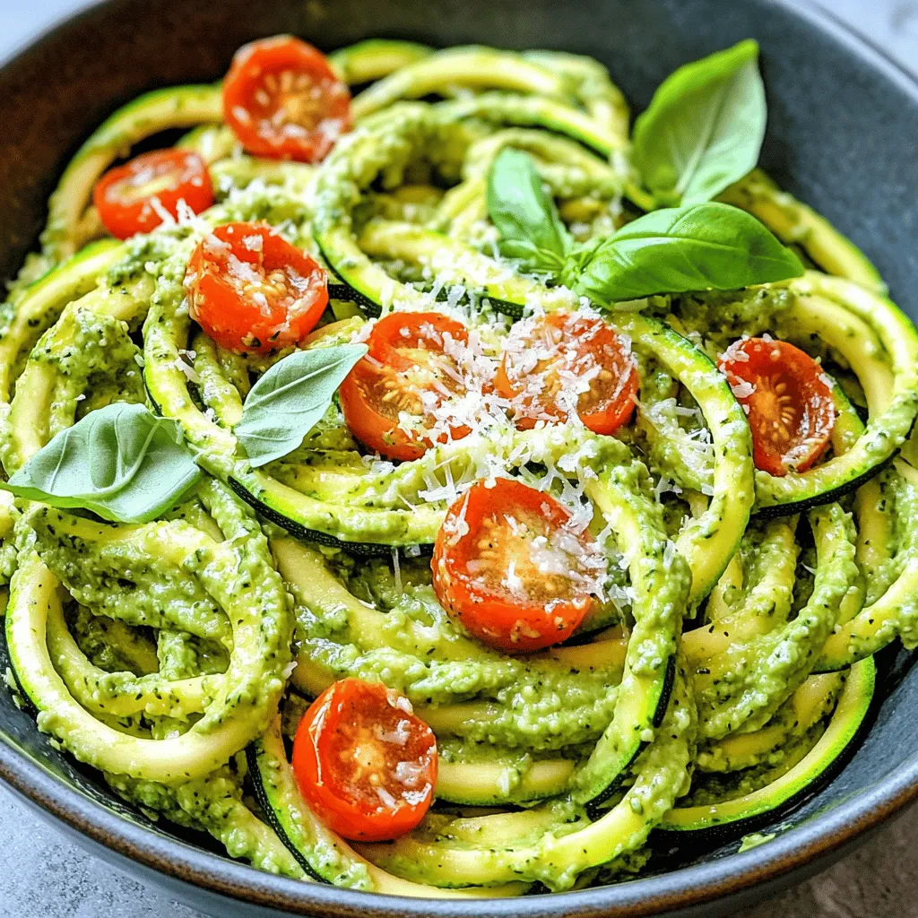 If you want to prepare meals in advance, you can make the pesto ahead of time. Store it in an airtight container in the fridge. Just remember to drizzle a bit of olive oil on top to keep it fresh. For the zoodles, spiralize them the night before and store them in a sealed bag with a paper towel. This helps absorb any extra moisture and keeps them crisp for your meal.
