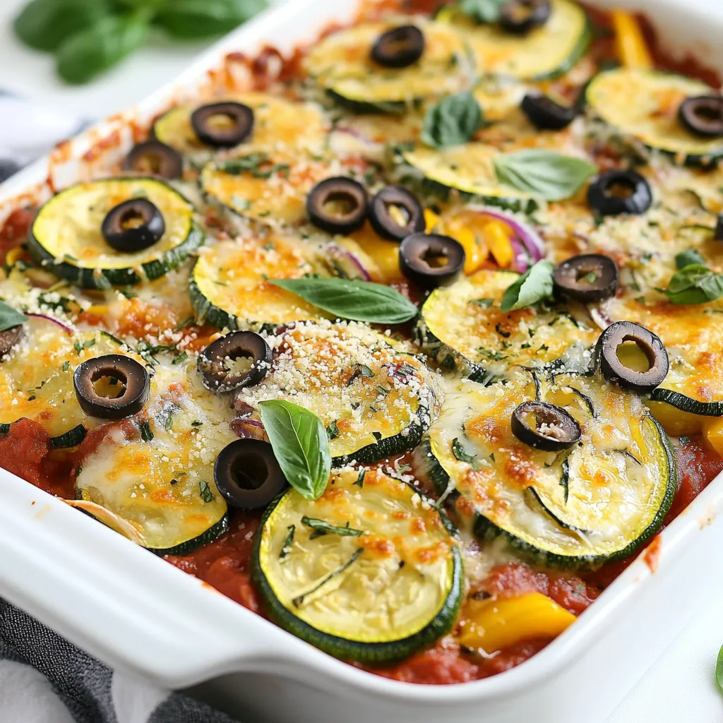 - Top with the remaining zucchini mixture, then sprinkle the rest of the mozzarella cheese. Finish with a sprinkle of grated Parmesan and the sliced black olives. Add red pepper flakes if desired.